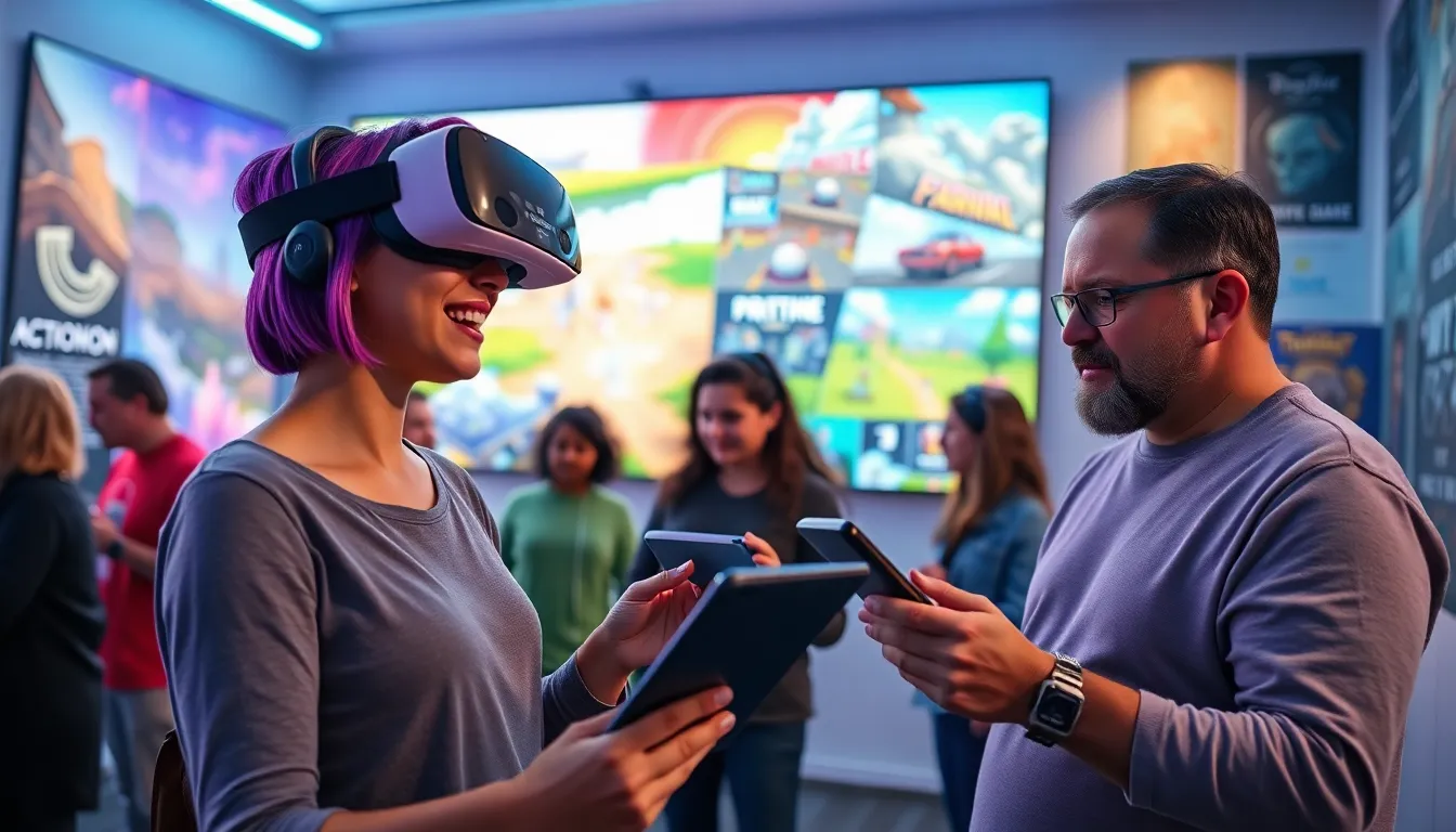 a diverse group of gamers enjoying various interactive games together.